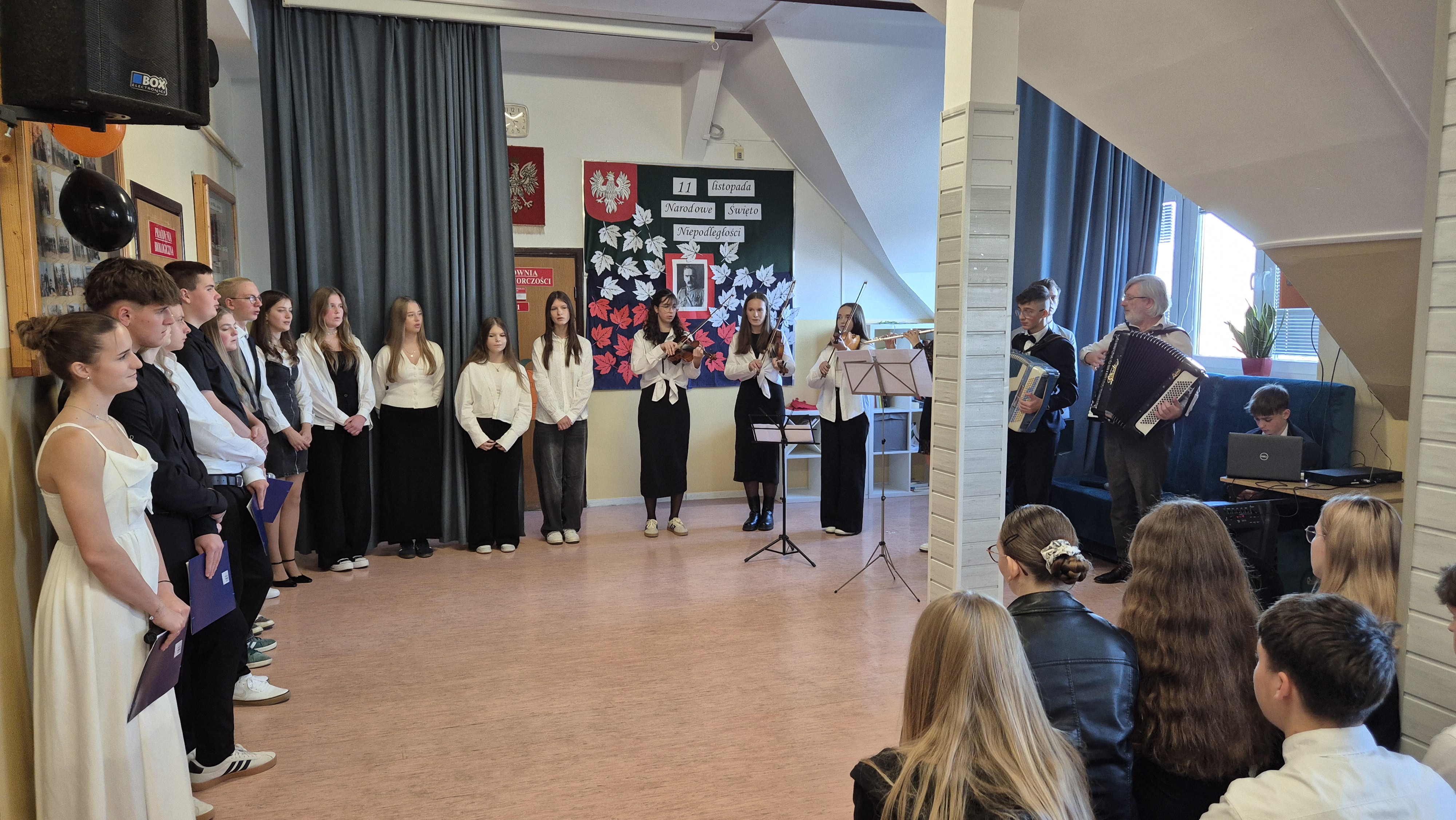 Uroczyste obchody Święta Niepodległości rozpoczęliśmy 7 listopada o godzinie 11.11 odśpiewaniem Hymnu Polskiego. W dalszej części młodzież przybliżyła drogę Polski do niepodległości. Całość przeplatana była pieśniami patriotycznymi w wykonaniu uczniów klasy pierwszej.