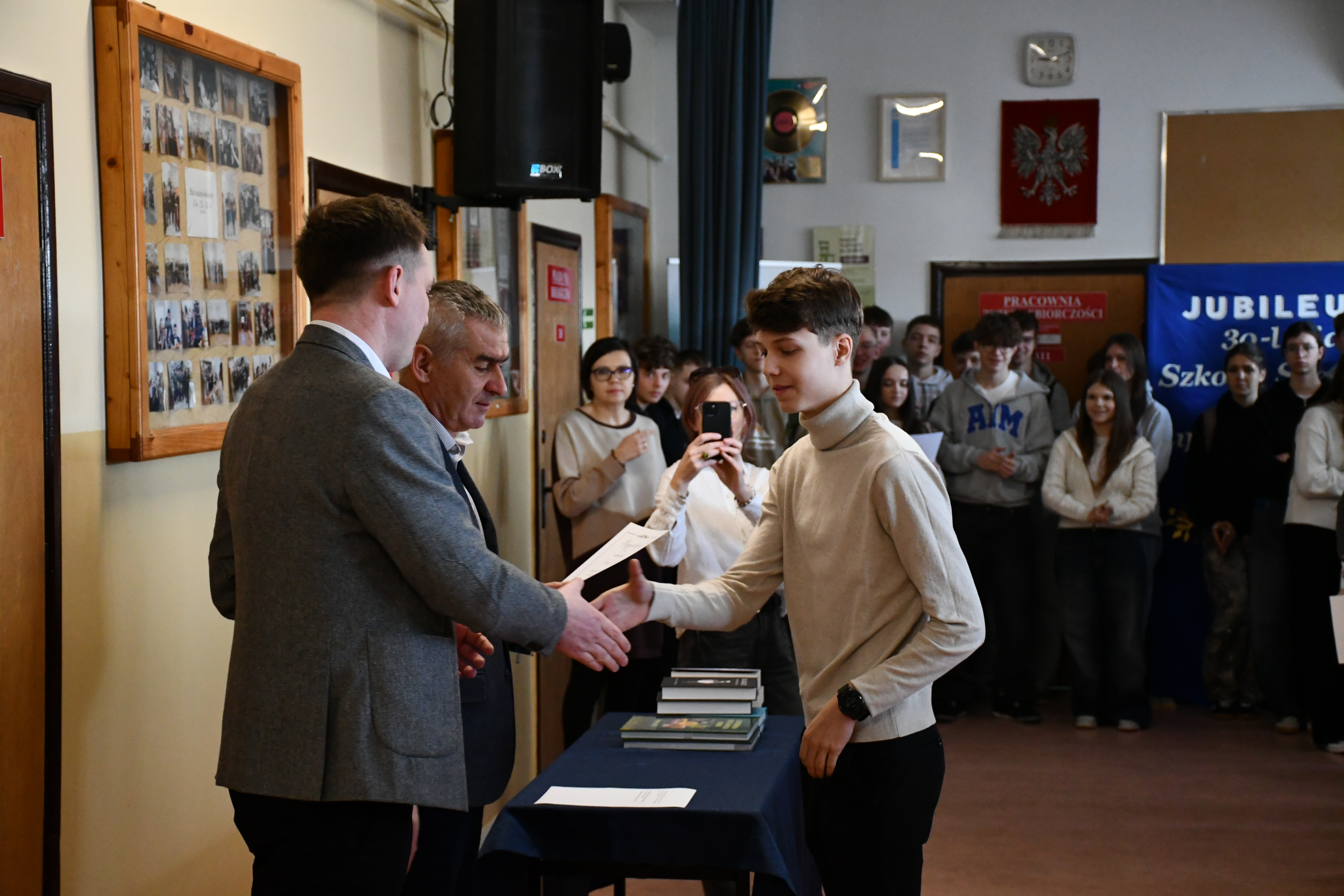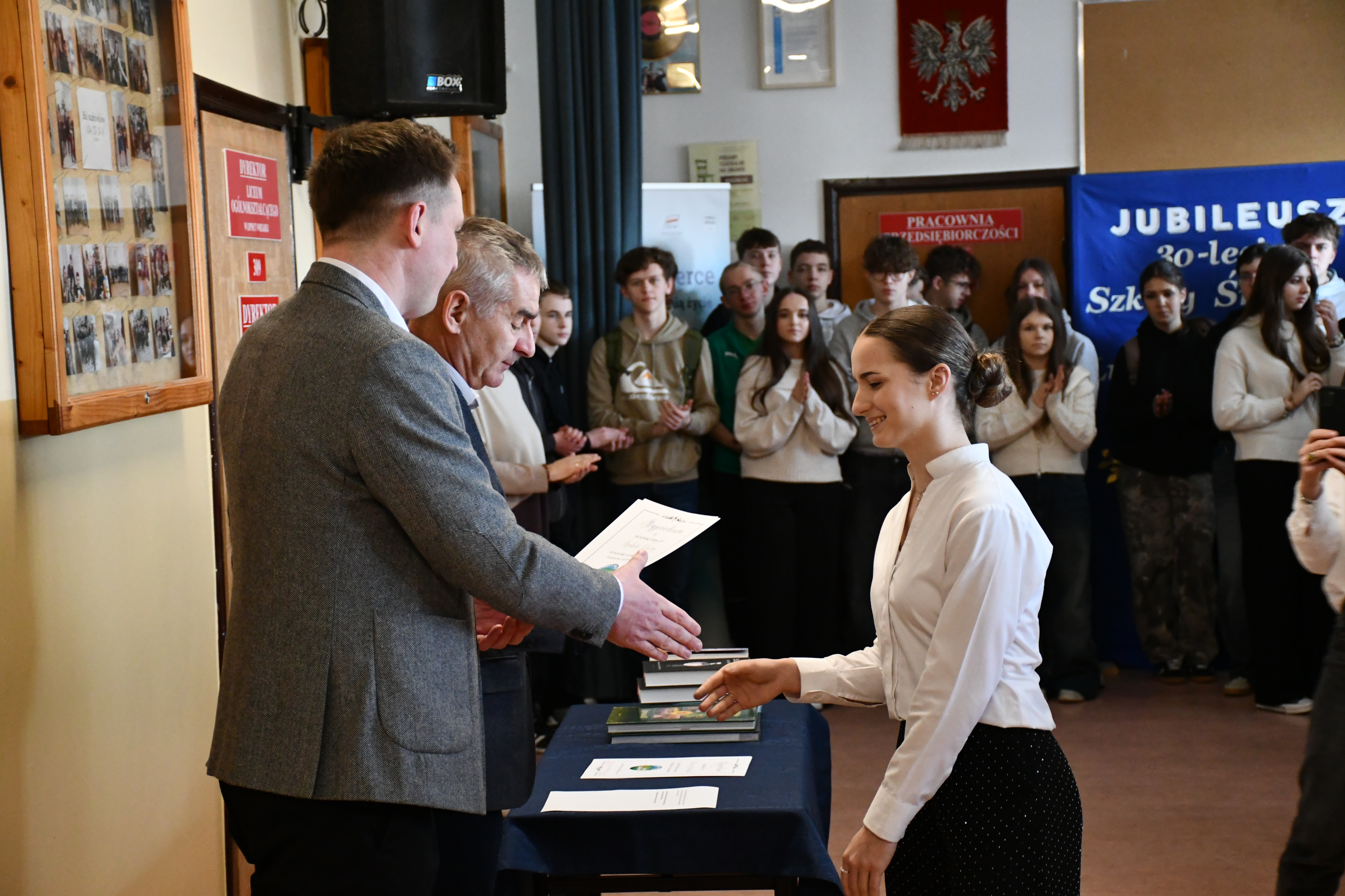 Mateusz Lichosyt Wójt Gminy złoży gratulacje wszystkim nagrodzonym życząc dalszych sukcesów. Złożył również podziękowania za przygotowanie jubileuszu 30-lecia i za godne reprezentowanie szkoły i gminy na zewnątrz zarówno pod względem wyników w nauce, konkursach przedmiotowych jak i współzawodnictwa sportowego.